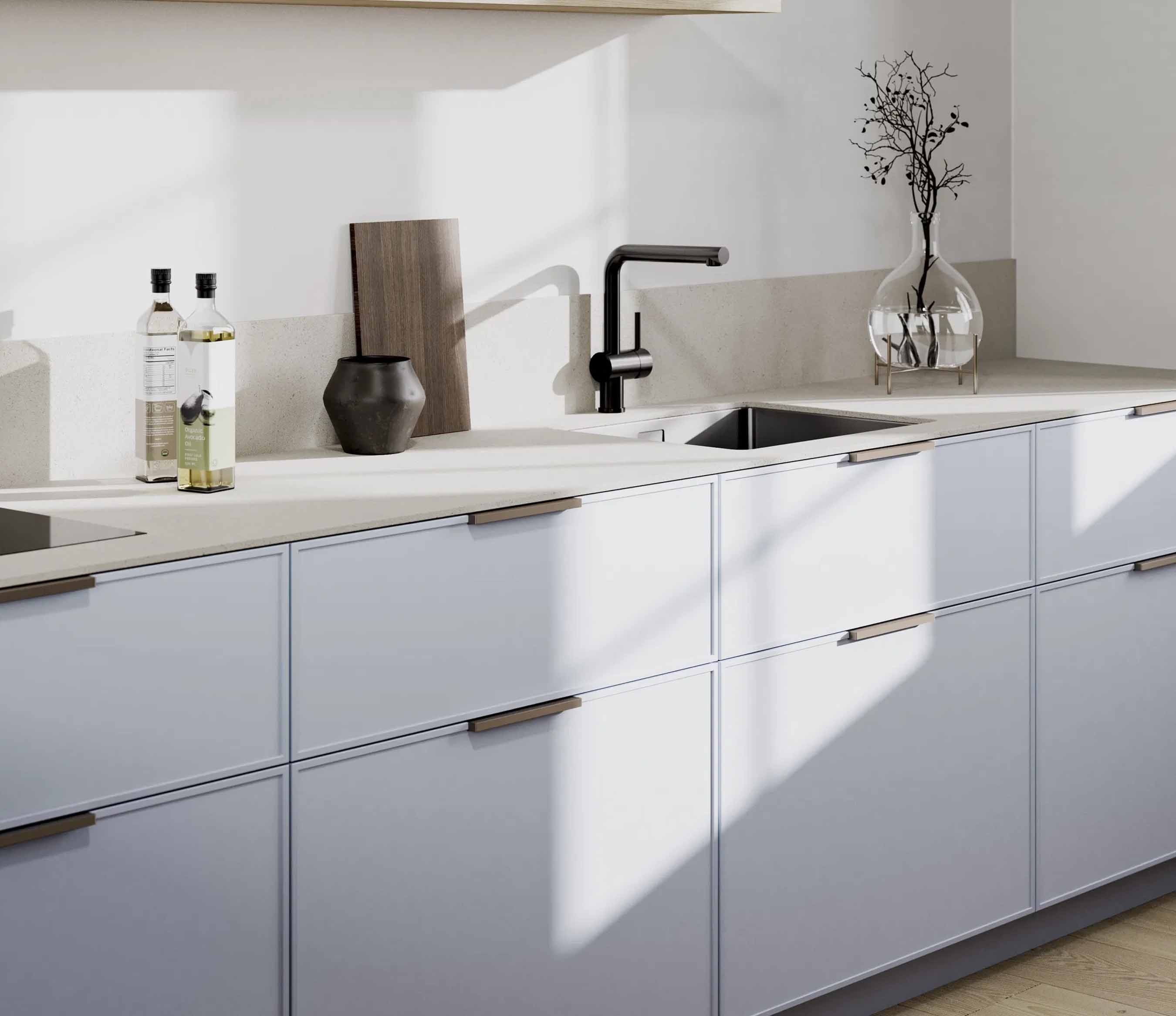 Des couleurs douces, des surfaces mates et des matériaux naturels créent des cuisines qui rayonnent de paix et de sécurité. Inspiré par l’attitude scandinave à l’égard de la vie, le concept hygge devient une attitude : des formes claires, des couleurs sobres et un design qui laisse place à la respiration. Des tons clairs comme le beige, l’abricot ou le blanc crème, combinés à un bleu subtil, au vert mousse ou au taupe, apportent légèreté et profondeur en même temps. Transformé en laque texturée, satinée mate, façades à cadre ou placages, le résultat est une cuisine harmonieuse, ralentissant l’atmosphère et, bien sûr, intégrée dans le salon.