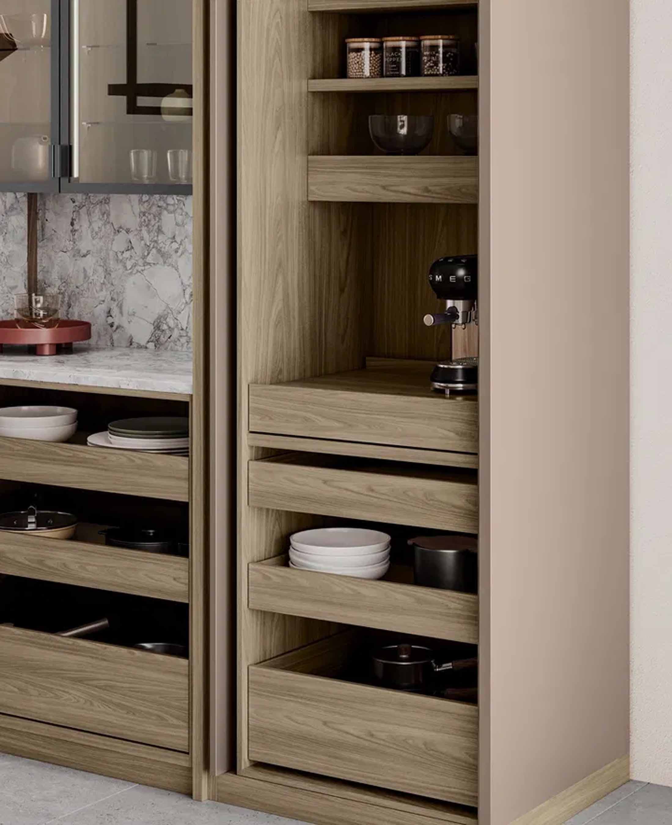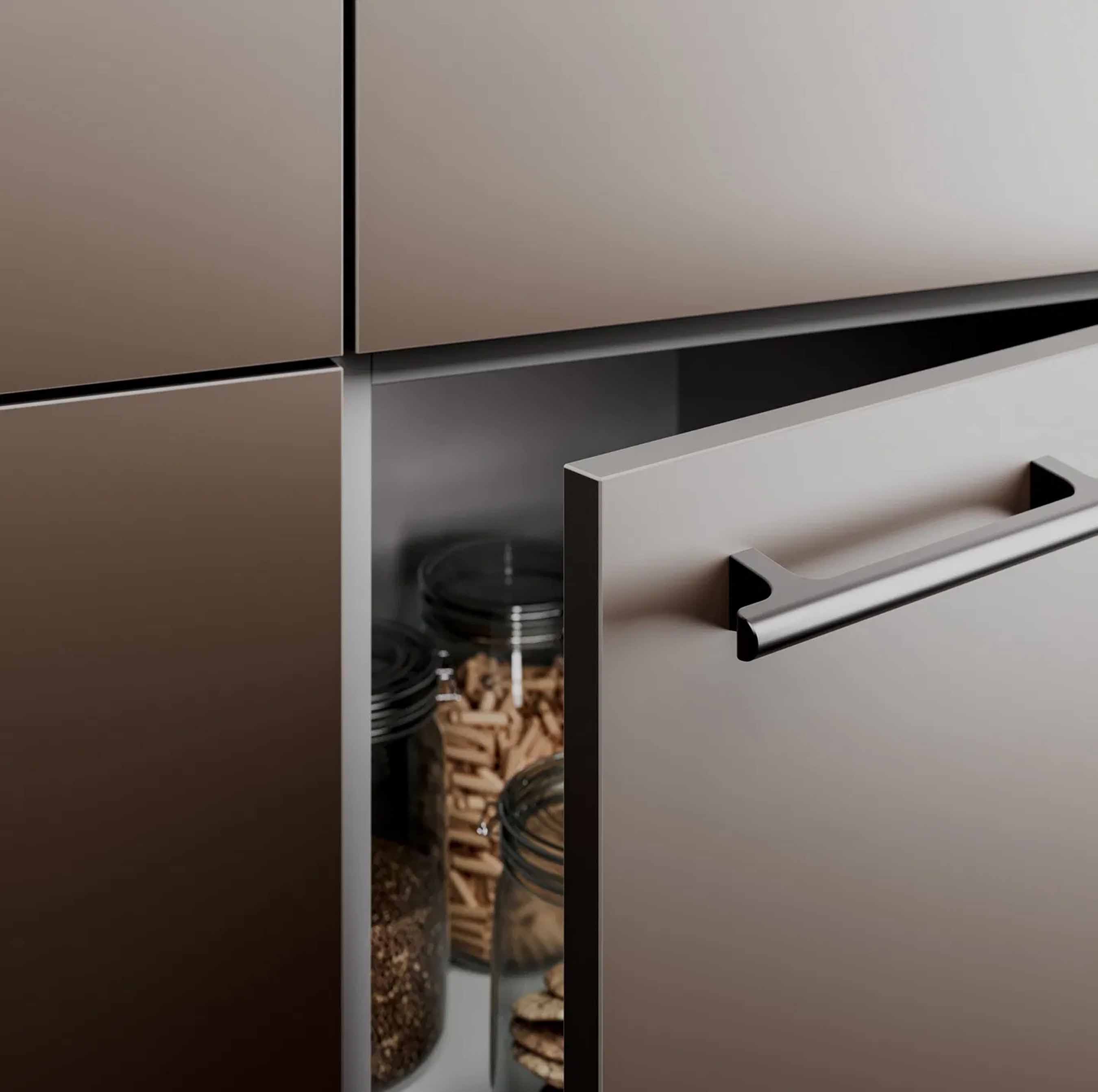 IDEA repose sur une surface en verre acrylique de haute qualité, disponible en quatre couleurs unies soigneusement sélectionnées. La surface mate et transparente rappelle le verre, tout en offrant une praticité maximale : elle est résistante aux rayures, aux chocs et aux UV. L’interaction entre transparence, brillance et opacité apporte de la profondeur à chaque cuisine, tandis que la couche de couleur sous la surface intensifie la teinte. Ce matériau combine élégance, durabilité et présence unique – parfait pour des cuisines alliant design et fonctionnalité.