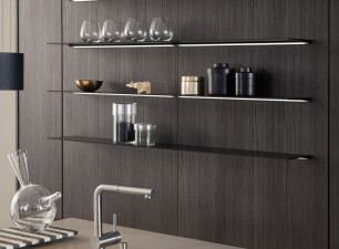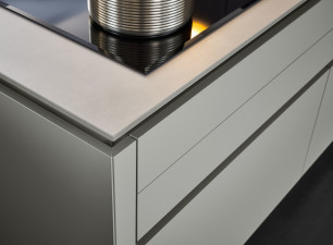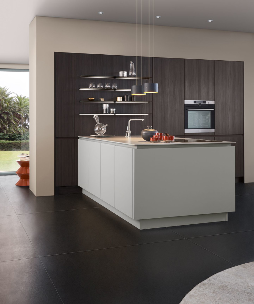 Le contraste clair/foncé est une combinaison de surface classique et usuelle dans l‘architecture d’intérieur. Avec la nouvelle couleur gris olive et la structure du robinier de montagne, LEICHT décline désormais cette combinaison dans une nouvelle apparence sobre et harmonieuse, au charisme élégant et haut de gamme. LEICHT présente pour la première fois les deux surfaces dans une composition harmonieuse de façade d‘armoire haute, d‘îlot et d‘étagères filigranes.