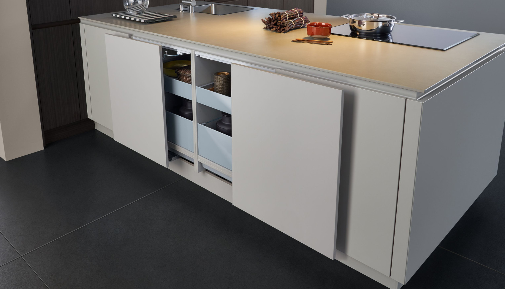 L‘élément de liaison est la poignée profil horizontale qui s‘étend sur tous les éléments d‘armoire à hauteur du plan de travail. Ce profilé peut être équipé en option d‘un éclairage à luminosité et température de couleur réglables individuellement.