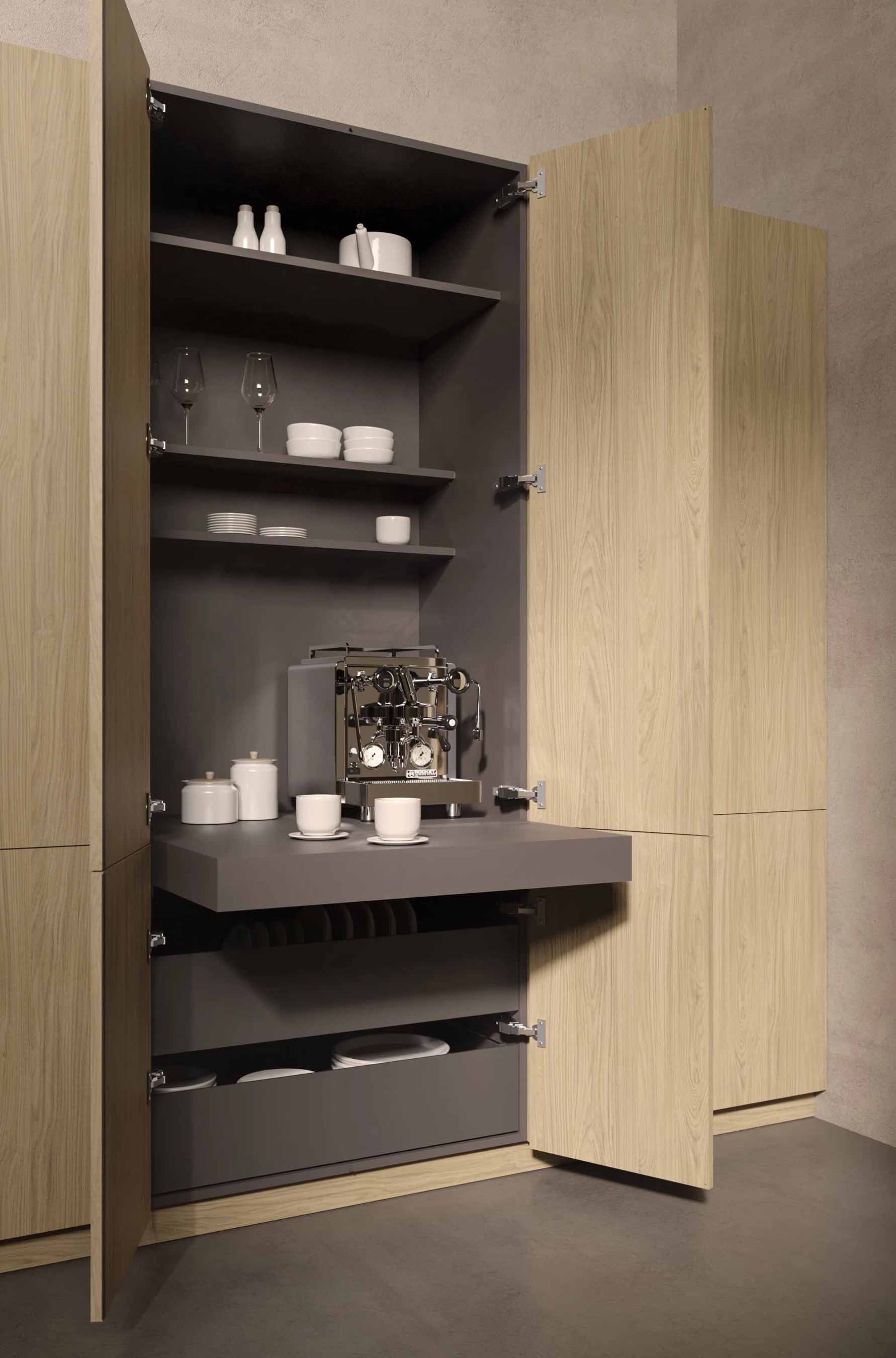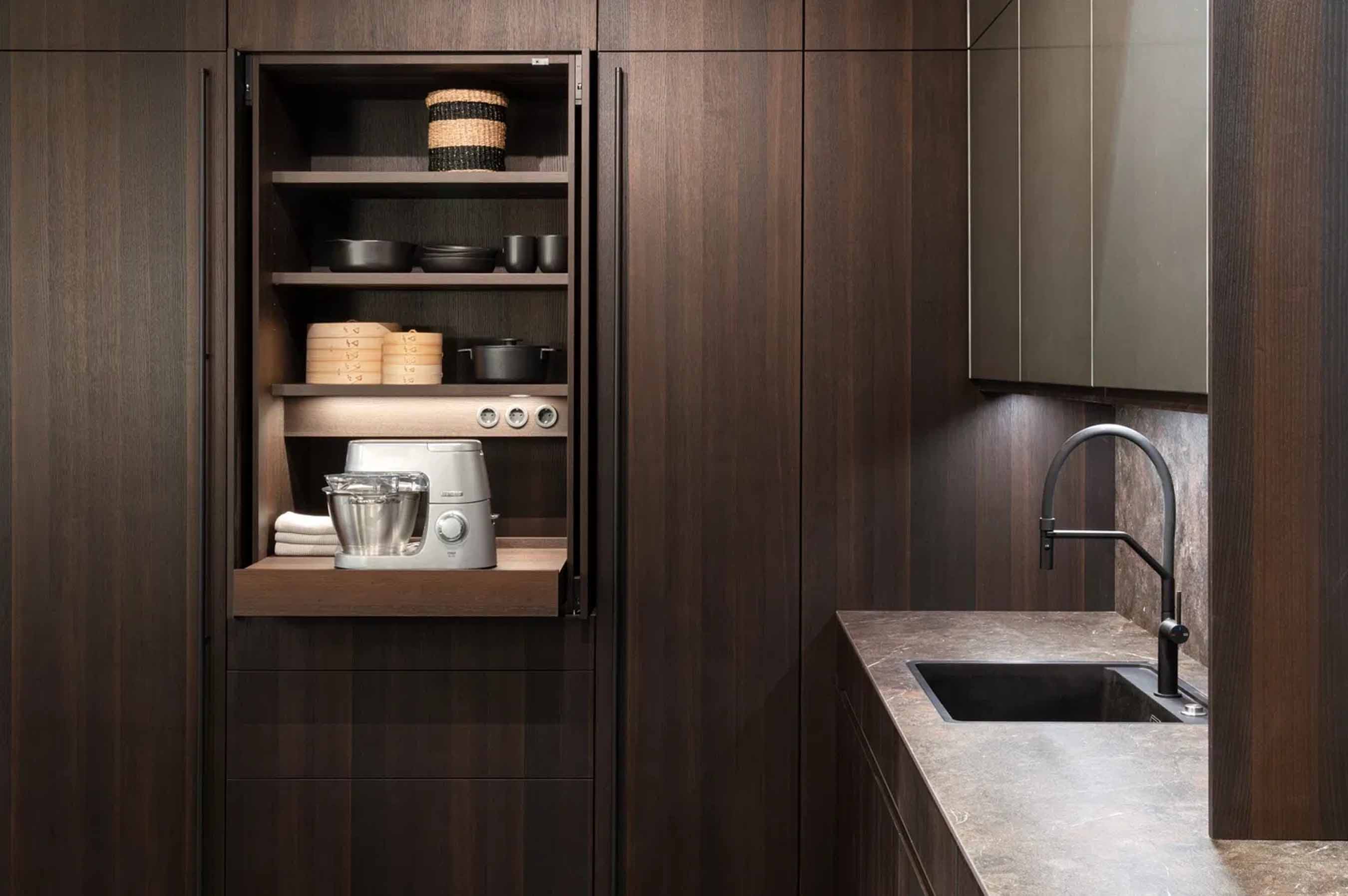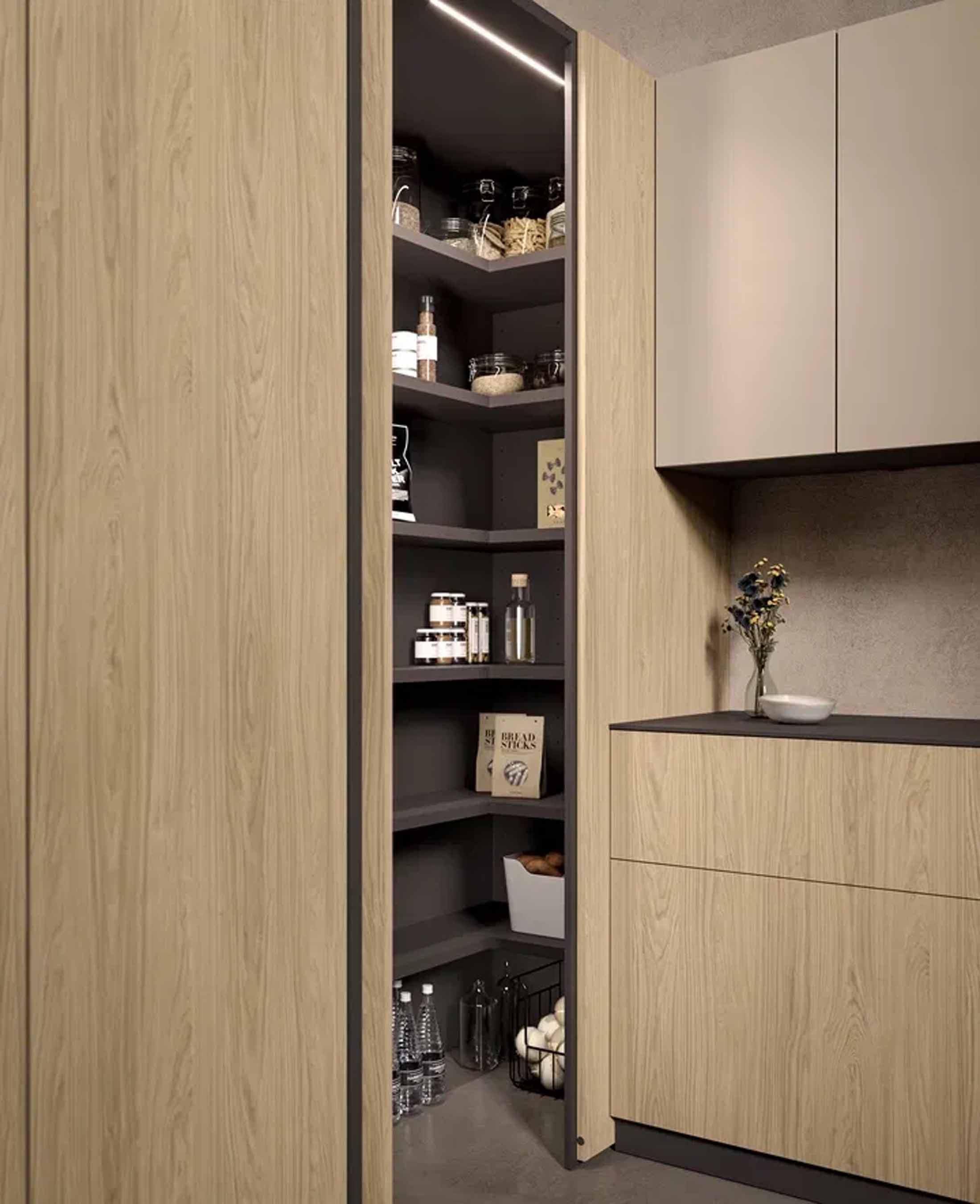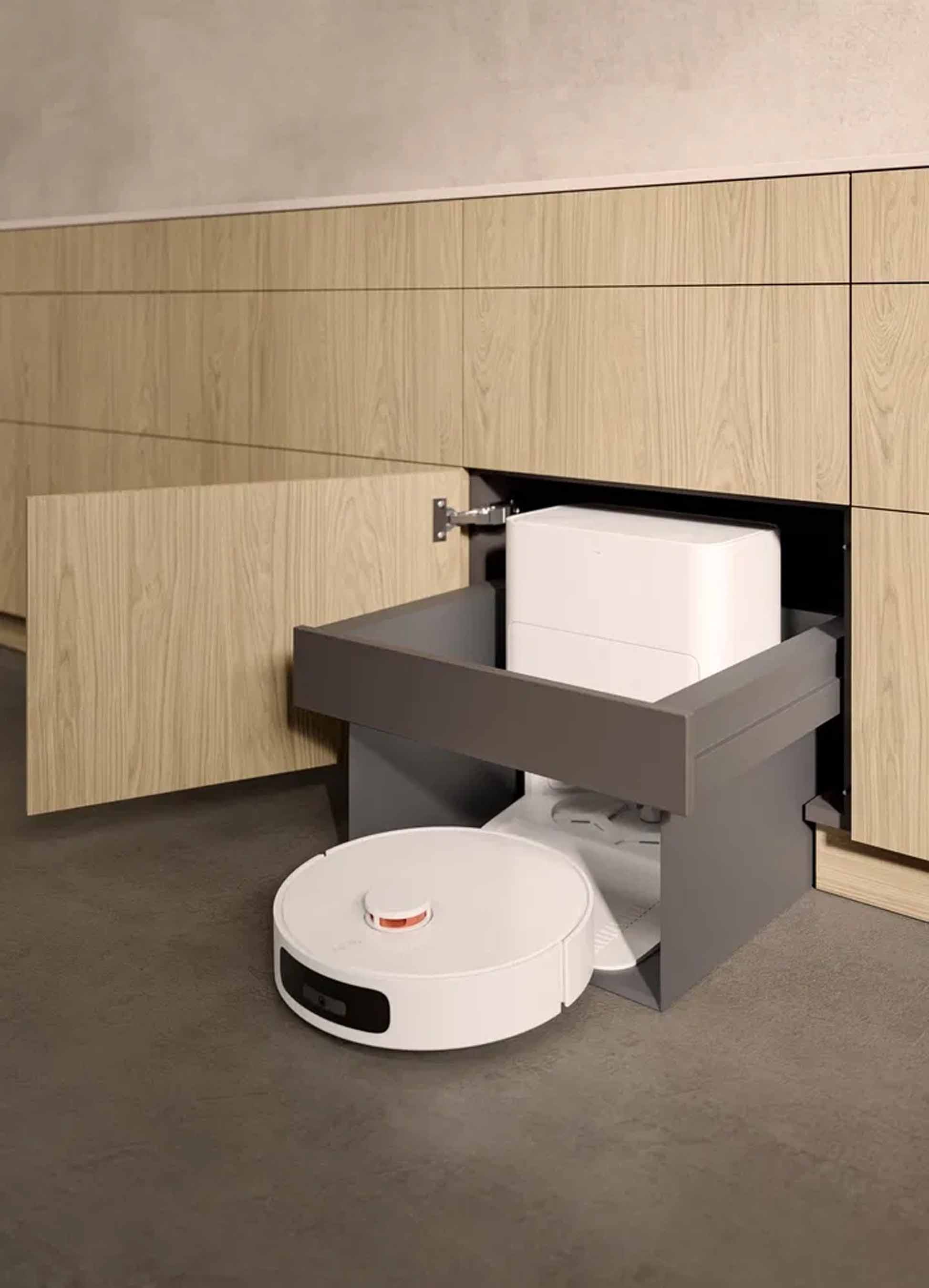 L’armoire à aspirateur robot est la solution idéale pour intégrer discrètement les aides ménagères modernes dans l’architecture de la cuisine. Derrière une porte tournante discrète se trouve un coulissant intérieur doté d’un bac métallique robuste dans lequel le robot peut facilement entrer et sortir via une découpe de socle comprenant une rampe. La poussière et la saleté restent à l’intérieur, tandis que la station de charge reste accessible à tout moment – pratique pour l’entretien et le nettoyage. De l’extérieur, l’élément est indiscernable des autres armoires, ce qui préserve le design harmonieux de la cuisine. Adaptée à de nombreux modèles disponibles dans le commerce, cette armoire offre confort, ordre et propreté sur simple pression d’un bouton.
