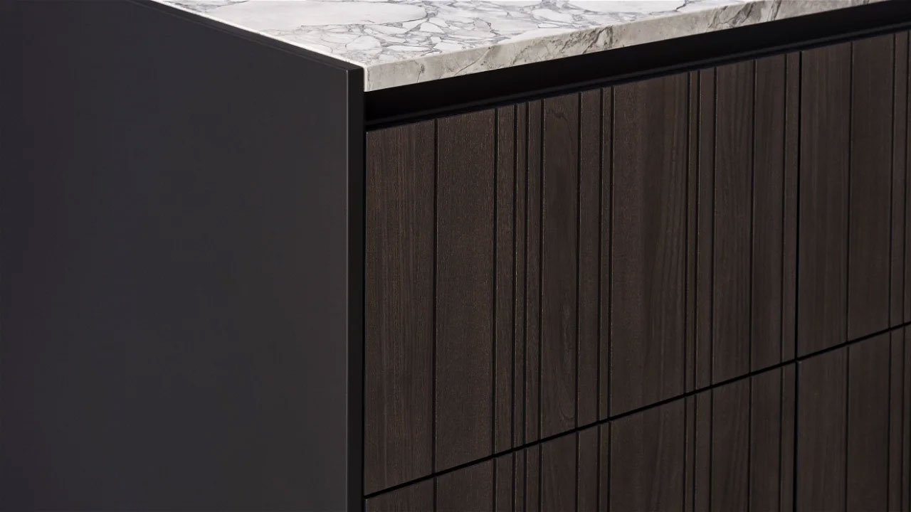 Les encoches verticales sombres et les coutures verticales se fondent harmonieusement les unes dans les autres, donnant l'apparence d'un seul meuble aux armoires individuelles.