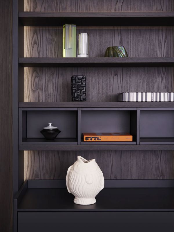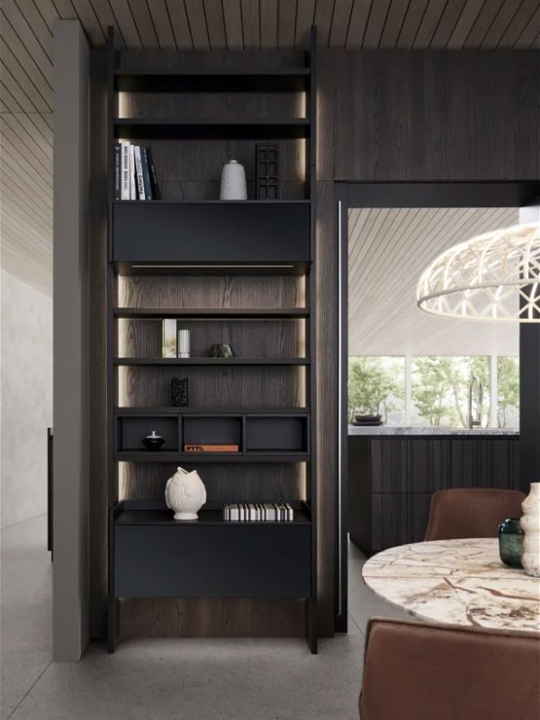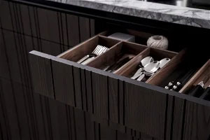 Le système d'extraction M8 met en valeur l'élégance des structures à rainures de la façade BAHIA et prolonge le principe de conception jusqu'au cœur même du meuble.