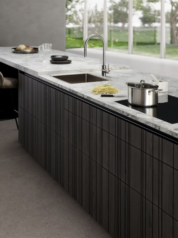 cette nouveauté se compose d'une façade en placage qui, grâce à une structure rainurée verticale, obtient une surface riche en tensions. BAHIA cite ainsi le programme de surface à succès BOSSA de LEICHT, mais s'en distingue par un principe de conception décisif : outre le contraste entre la surface en relief et le fraisage, la particularité de BAHIA réside dans l'association de deux contraires apparents : Au sein d'une même façade, les différents fraisages sont placés de manière asymétrique les uns par rapport aux autres, mais dans la juxtaposition de plusieurs façades, une même structure en éventail se dessine.